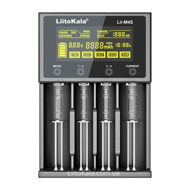 LiitoKala Lii-M4S – универсальное интеллектуальное зарядное устройство на 4 независимых канала с контрастным LED дисплеем и с функцией Power Bank. За функционалом и выполнением зарядного устройства Liitokala Lii-M4S напоминает модель Lii-500S, но модель Lii-MS4 имеет питание от USB-C и за счет этого более доступную цену по сравнению с Lii-500S. Зарядное устройство Liitokala Lii-M4S может работать с различными типами и форматами цилиндрических аккумуляторов. Liitokala Lii-M4S - многофункциональное зарядное устройство, оно может заряжать, разряжать, тестировать аккумуляторы, а также готовить аккумуляторы к хранению (функция STORAGE). У Lii-M4S есть функция Павер банк, с помощью которой Вы сможете заряжать мобильные телефоны, смартфоны, планшеты, электронные книги и др.