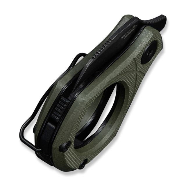Нож оснащен полноценной стальной клипсой. Ее можно переставить под правую или левую руку, или же использовать нож как зажим для банкнот. Также в рукоятке предусмотрено отверстие для крепления на кольцо ключей или темляк.