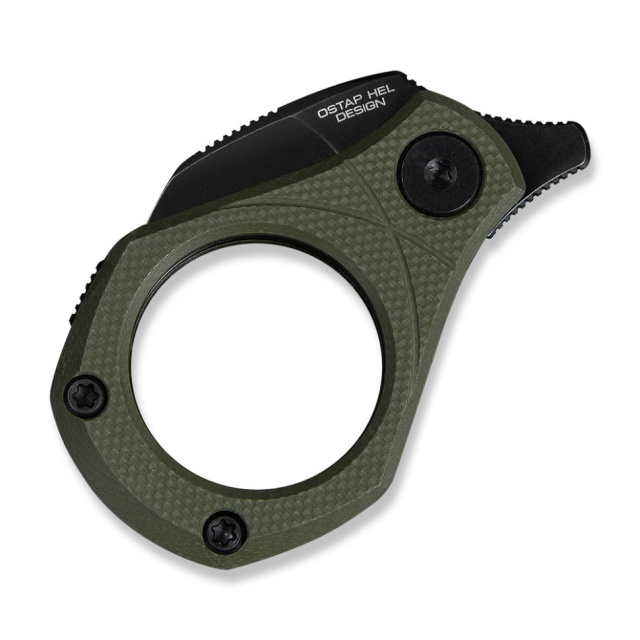 Рукоятка из композита G10. Накладки оливкового цвета имеют четкую текстуру, позволяющую уверенно держать нож двумя или тремя пальцами. Материал устойчив к ударам и не впитывает запахи.