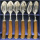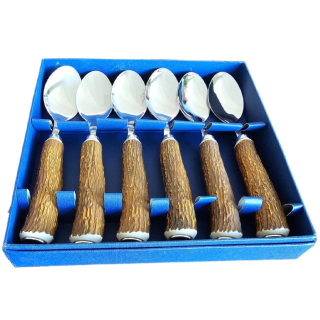Вироби виготовлені з високоякісної нержавіючої сталі, що гарантує міцність, довговічність і стійкість до корозії. Рукоятки виконані у формі імітації рогів із полістоуну з мікронним золотим напиленням, що додає набору благородства, преміального вигляду та підкреслює характерний мисливський стиль.