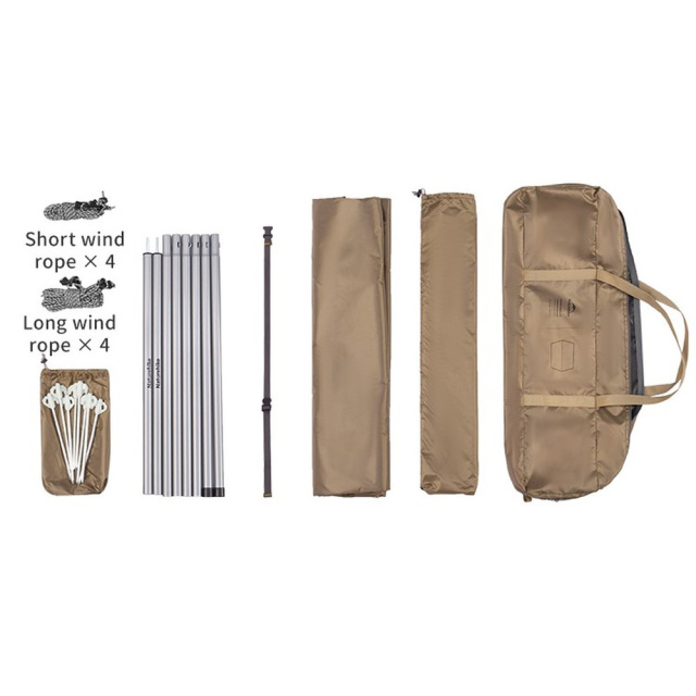 Тент Naturehike CNK2350WS015, стойки (2 шт), короткие ветрооттяжки (4 шт), длинные ветрооттяжки (4 шт), колышки (8 шт), компрессионный ремень, чехол для колышков, сумка для хранения.