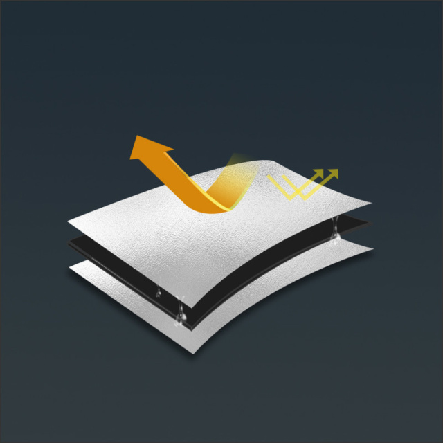 Многослойный материал. Коврик выполнен из комбинированного материала PE с алюминиевой пленкой, образующей трехслойную структуру. Слой из алюминия работает как отбеливатель, который снижает теплопотери, создает барьер между телом и холодной землей, отталкивает влагу и помогает дольше сохранять комфортную температуру. PE отвечает за теплоизоляцию и мягкость.